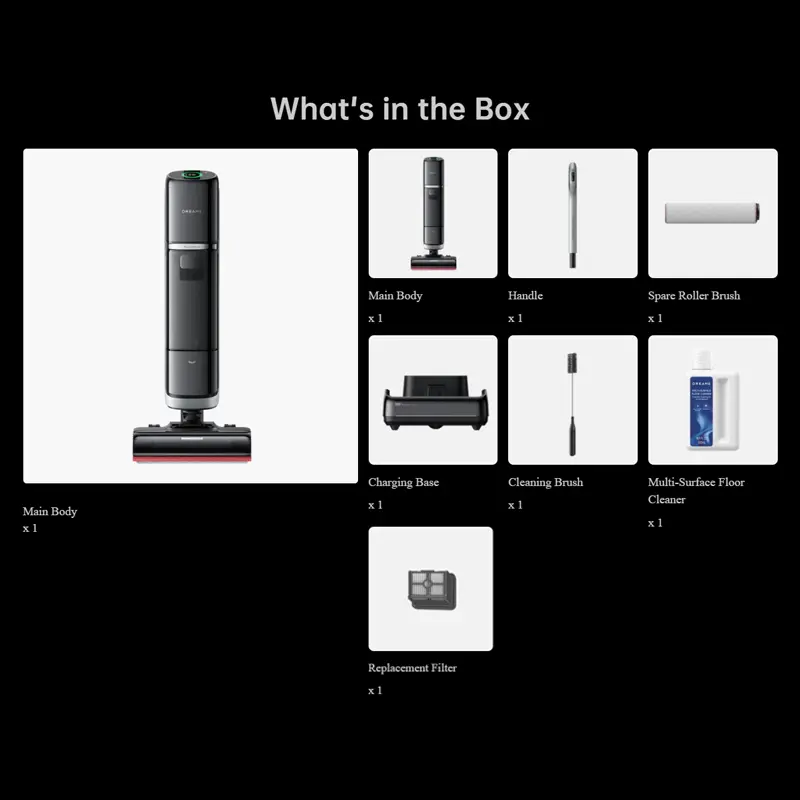 | محتویات درون جعبه | بدنه اصلی دستگاه, برس اصلی + برس یدکی (Spare Roller Brush), پایه شارژ (Charging Base), دسته (Handle), فیلتر جایگزین (Replacement Filter), مایع پاککننده چند سطحی (Multi-Surface Floor Cleaner) |